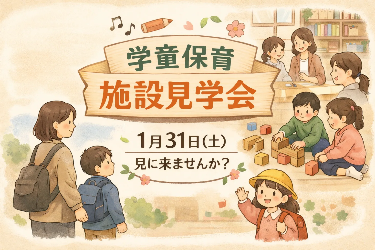 未分類学童保育施設見学会のお知らせ(1月31日 土曜日) 1月31日(土曜日)学童保育の施設見学会を開催することになりました🌸「どんな場所なんだろう?」「子どもが安心して過ごせるかな?」そんな疑問や不安を、実際に見て・感じていただける機会です。当日は、施設内を自由にご覧いただきながら、学童での過ご... 2026.01.14未分類
